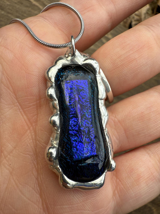 Cobalt Blue Iridescent Fused Glass Pendant | Vaporwave Brutalist Handmade Wearable Art + Whimsigoth Fashion