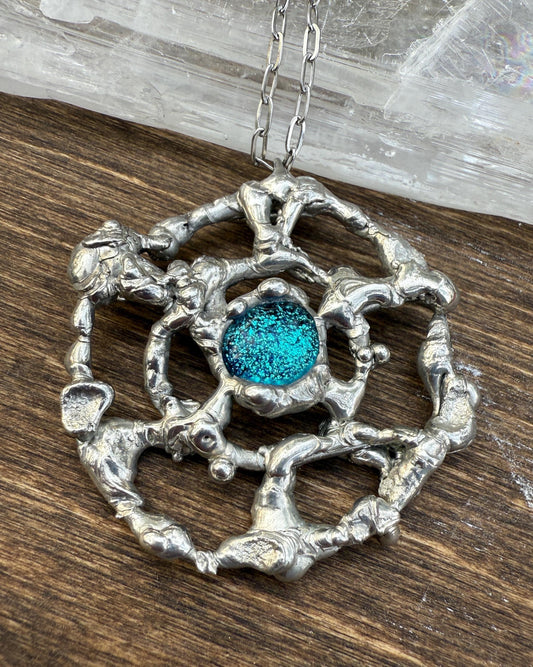 Cyber Sigilism Fused Glass Blue Pendant - Handmade Brutalist Statement Necklace, Fantasy, Punk, Gothic Jewelry