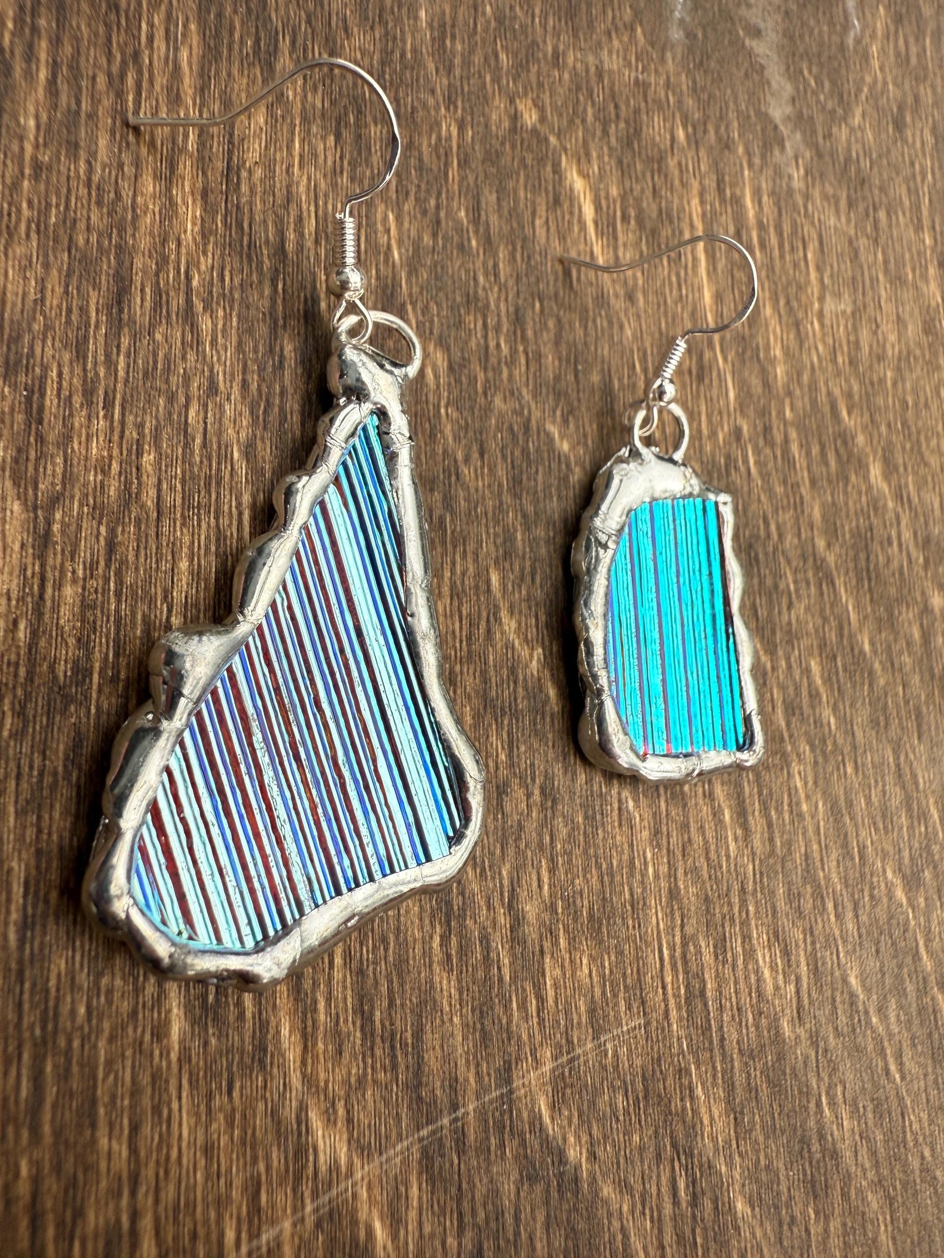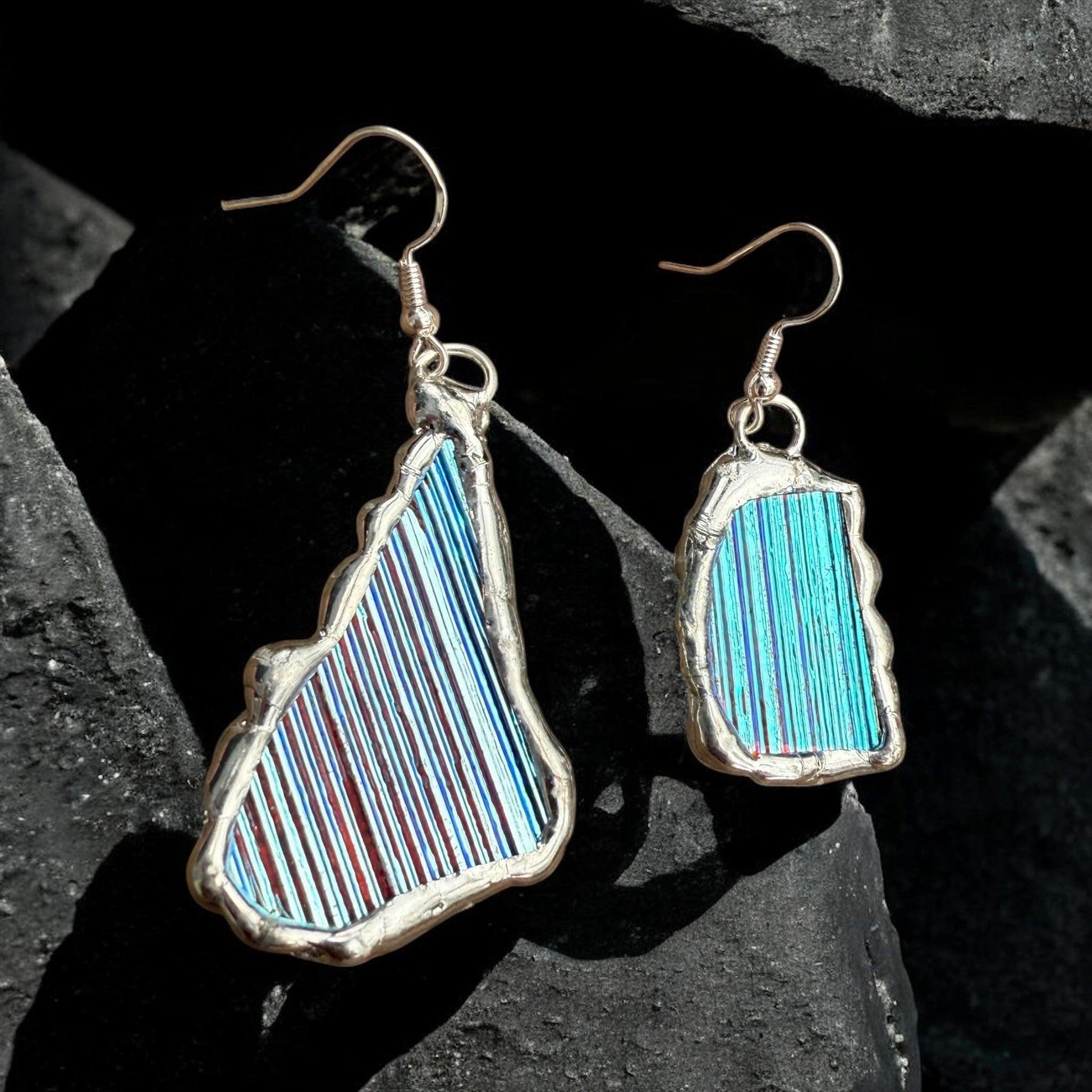 Baby Blue Iridescent Stained Glass Earrings | Handmade, Mismatched, Abstract, Wearable Sculptures