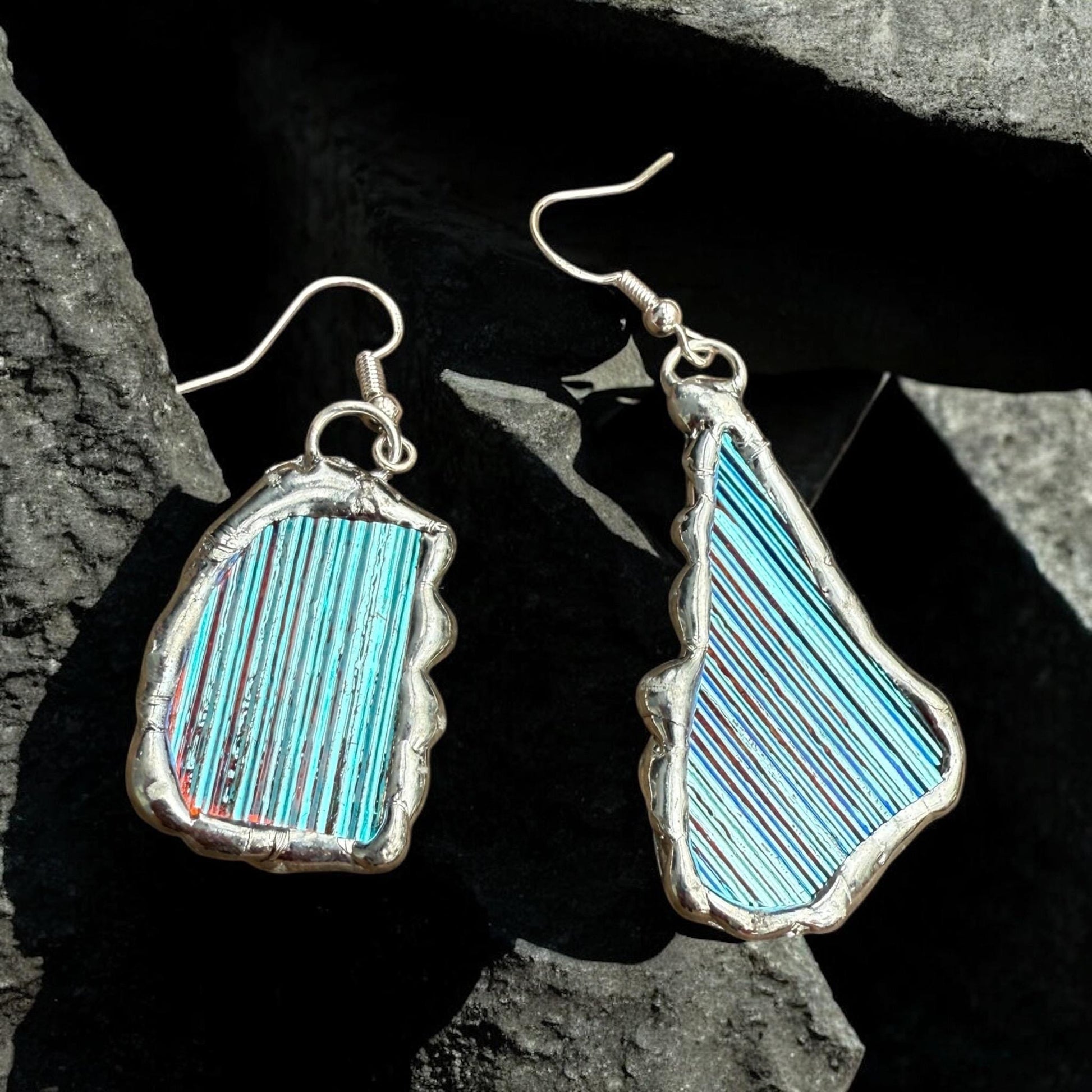 Step through the veil. Thiese handmade soldered stained glass earrings have asymmetrical cuts of dichroic glass that shift between baby blue and orange. They are hung on sterling silver ear hooks, this piece feels like a celestial portal artifact pulled from a cyberpunk fairy realm—equal parts fantasy, brutalist, whimsigoth, and Y2K mysticism.