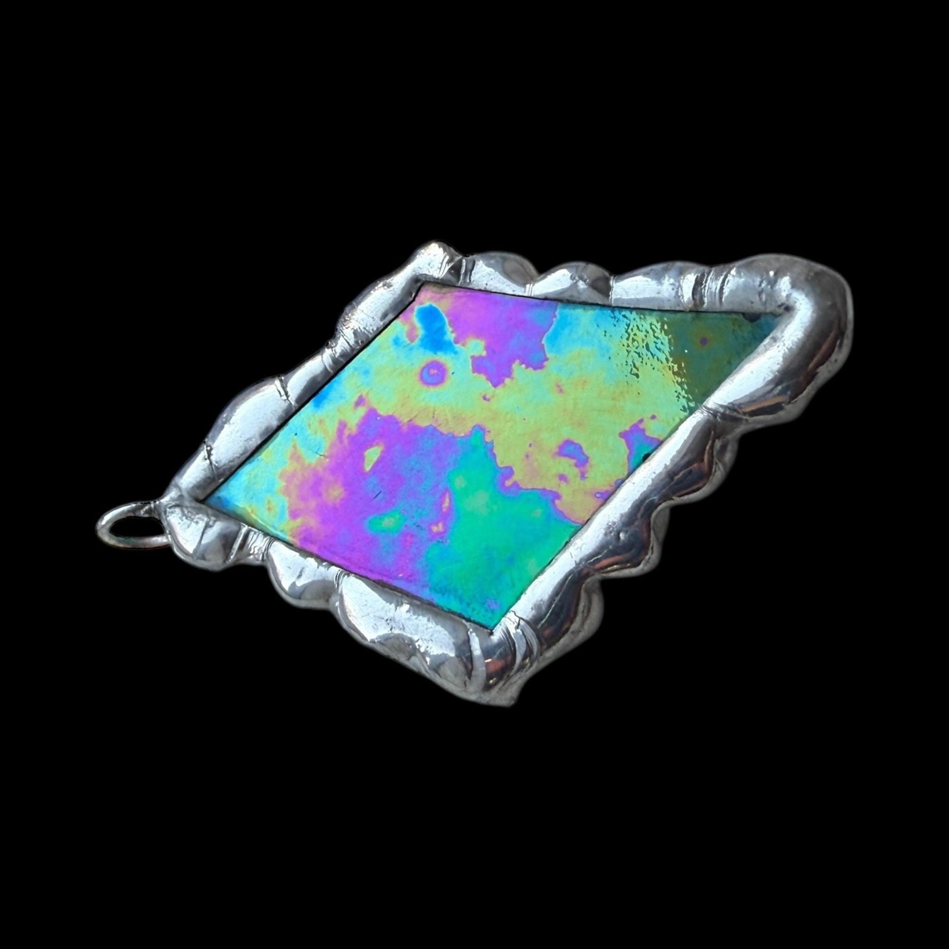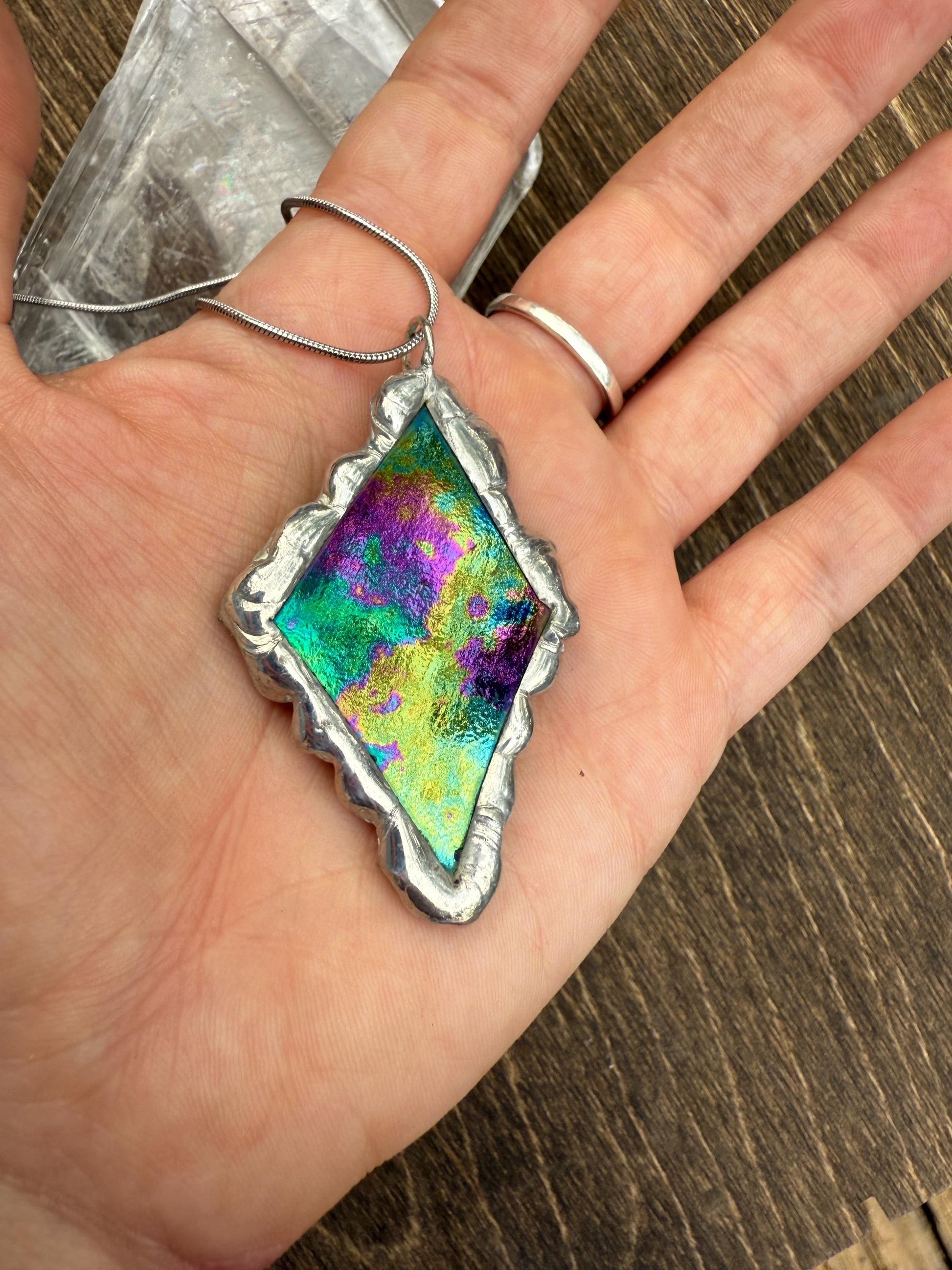 Iridescent Stained Glass Pendant | Diamond Shaped Handmade Wearable Art + Rave Fashion for Fantasy Lovers