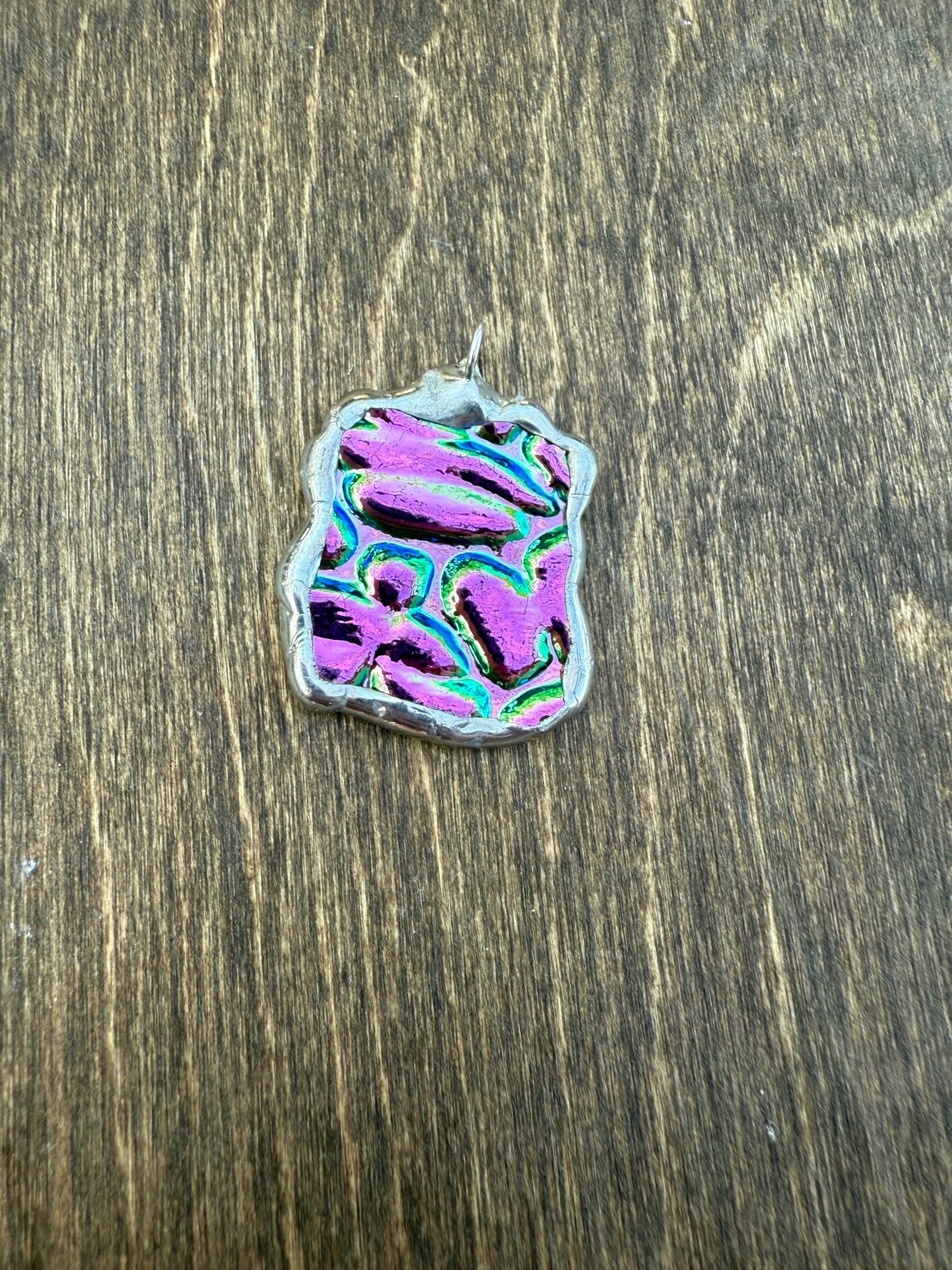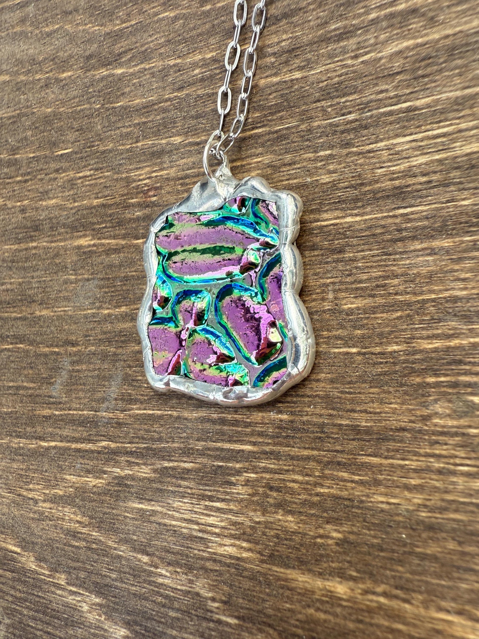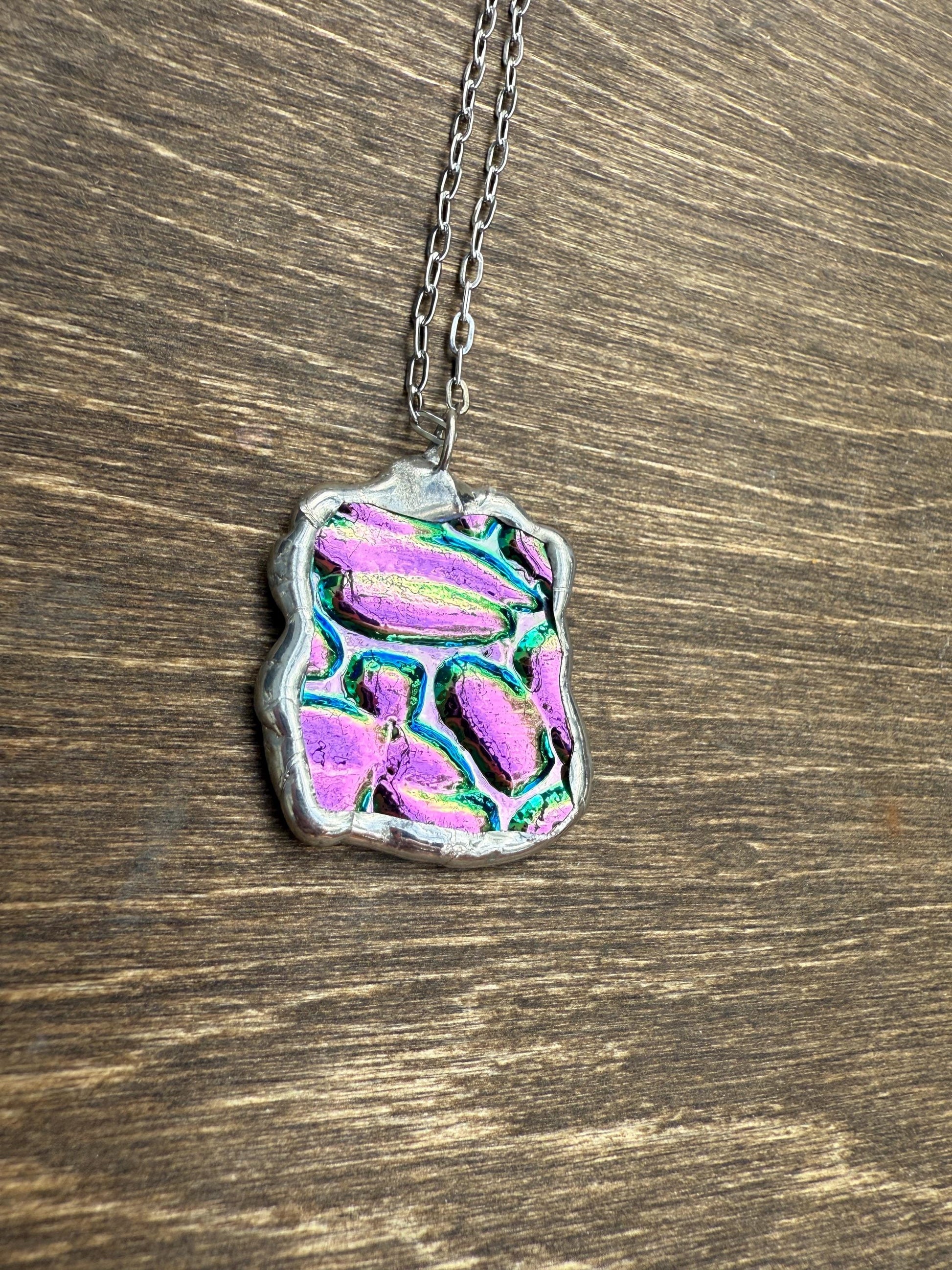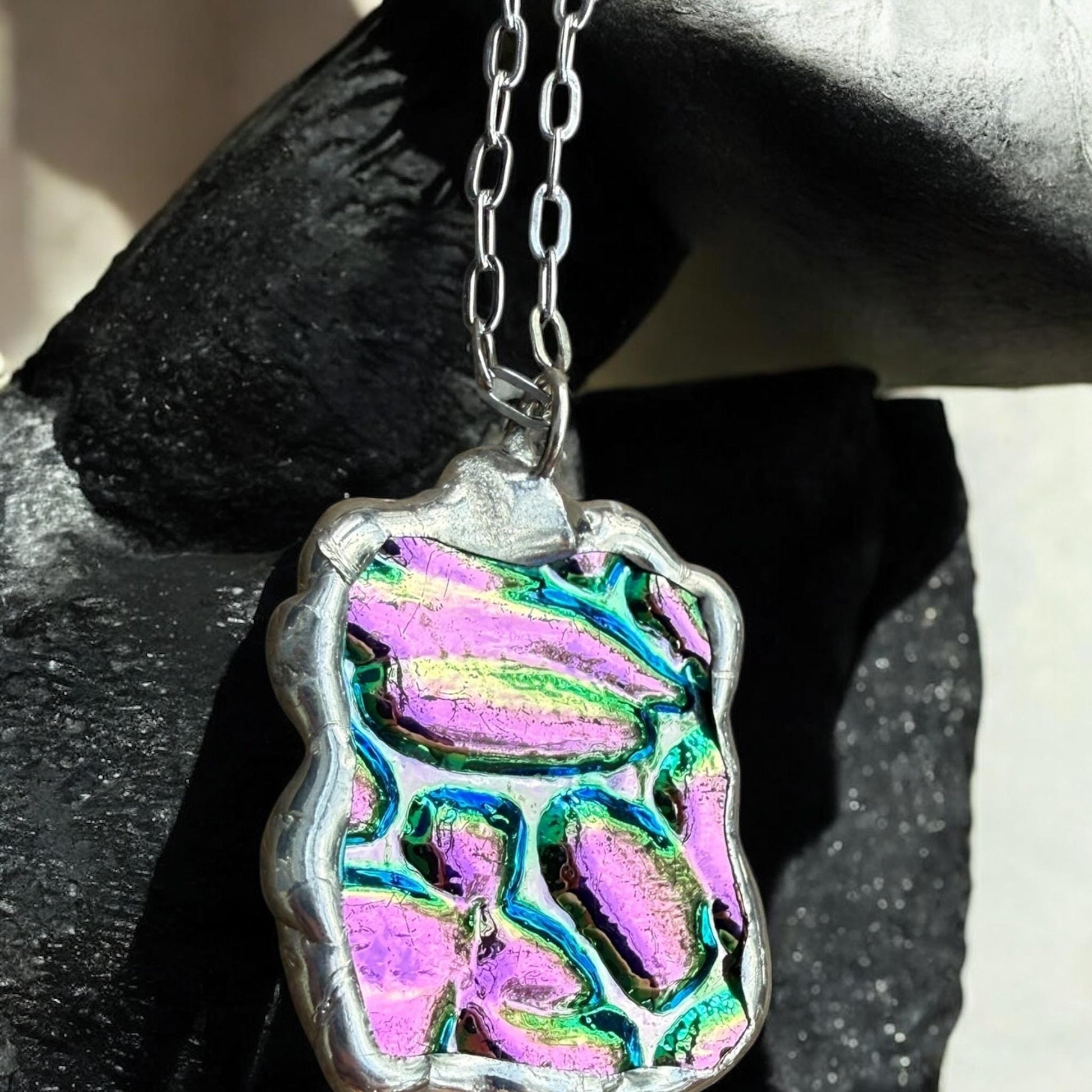 Step through the veil. This handmade stained glass pendant necklace features iridescent textured glass that shifts between pink and green. Soft-soldered by hand and suspended from a sterling silver chain, this piece feels like a celestial portal artifact pulled from a cyberpunk fairy realm—equal parts fantasy, brutalist, whimsigoth, and Y2K mysticism.