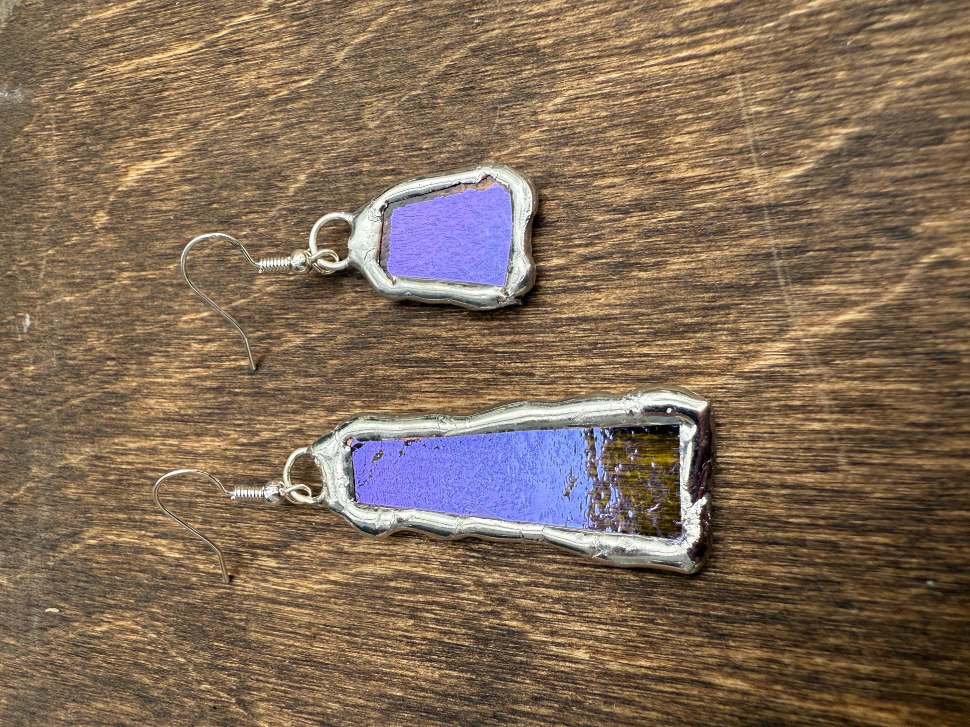 Purple Iridescent Stained Glass Earrings | Handmade, Mismatched, Abstract, Wearable Sculptures