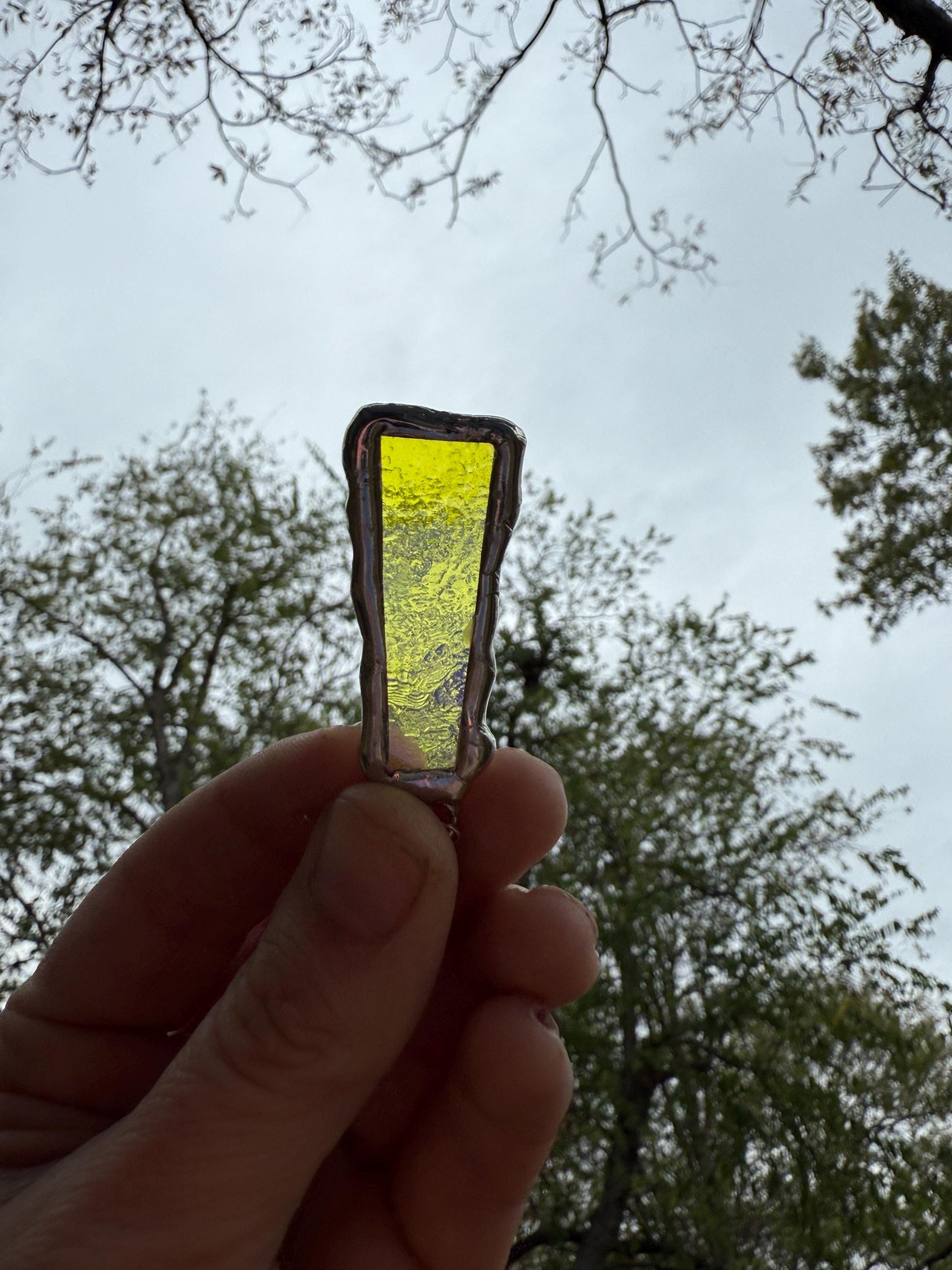 Step through the veil. These handmade asymmetrical soldered stained glass earrings have asymmetrical cuts of dichroic glass that shift between an icy purple and yellow. They are hung on sterling silver ear hooks, this piece feels like a celestial portal artifact pulled from a cyberpunk fairy realm—equal parts fantasy, brutalist, whimsigoth, and Y2K mysticism.