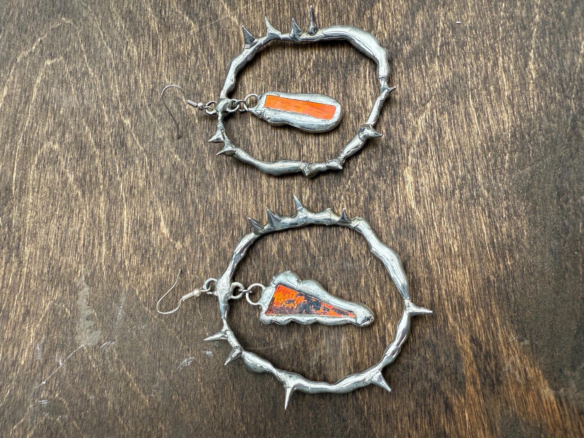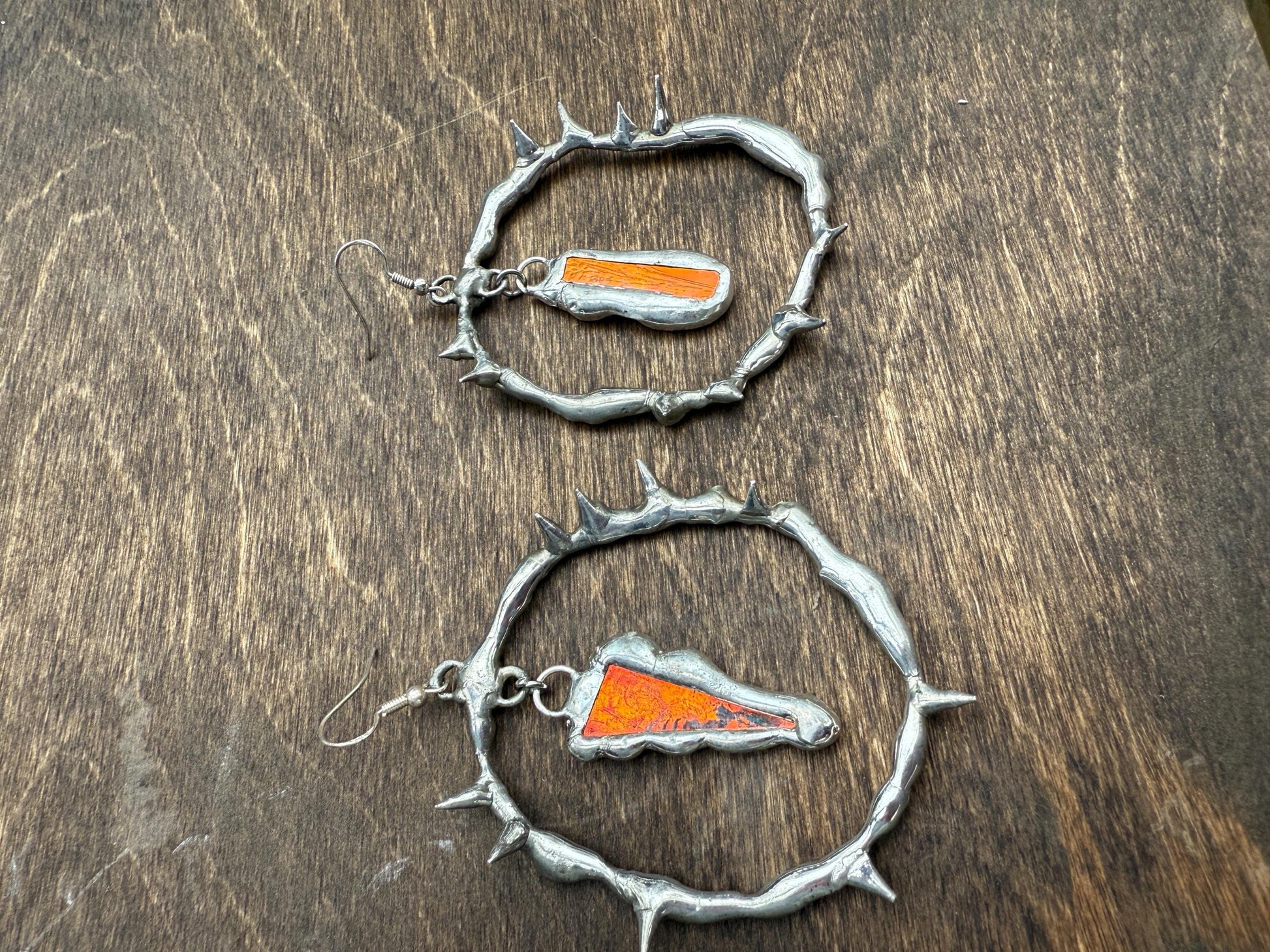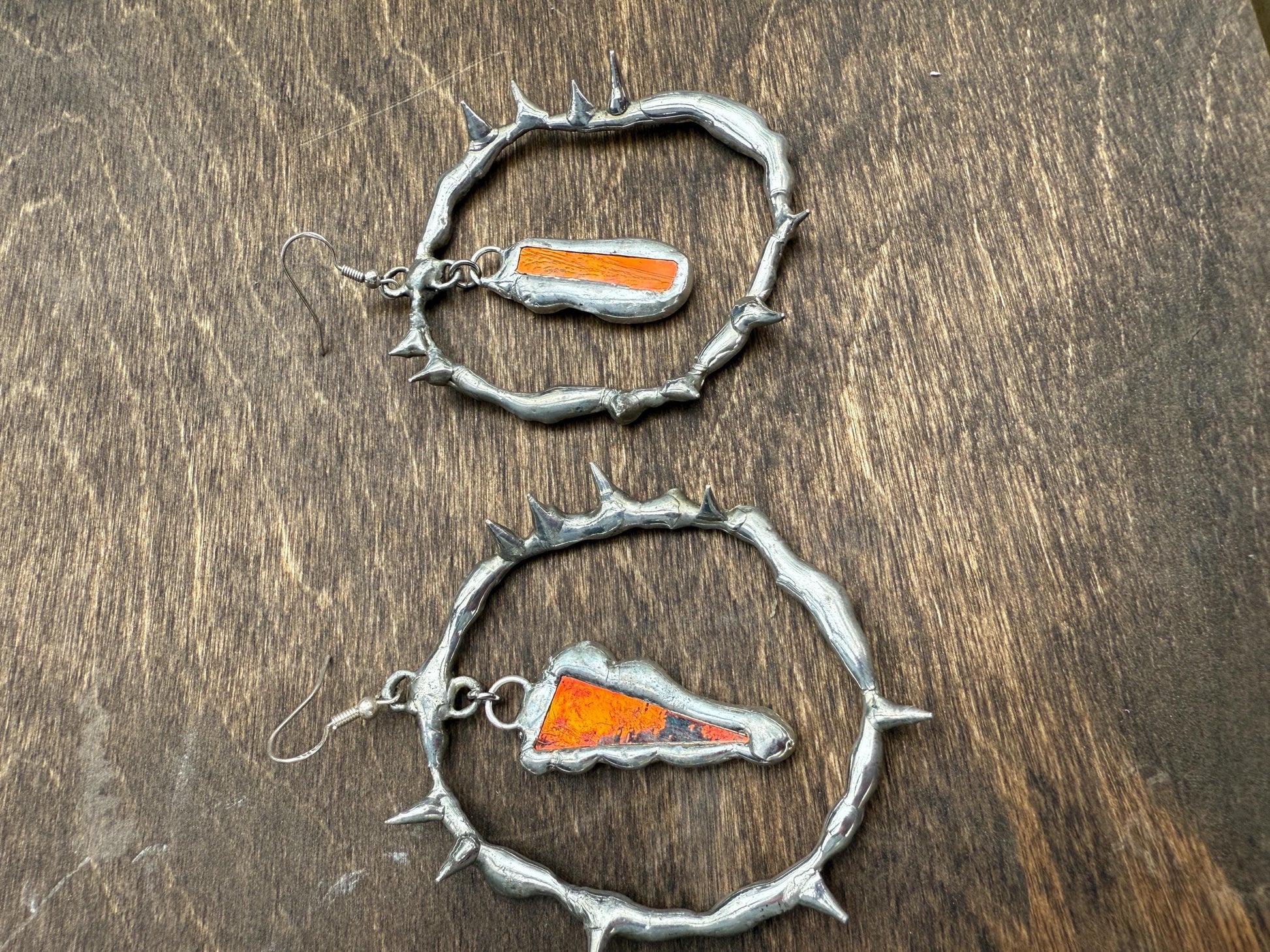 Spikey Silver Hoop Earrings w/ Orange Stained Glass | Cyber Iridescent Soft Soldered Wearable Sculptures
