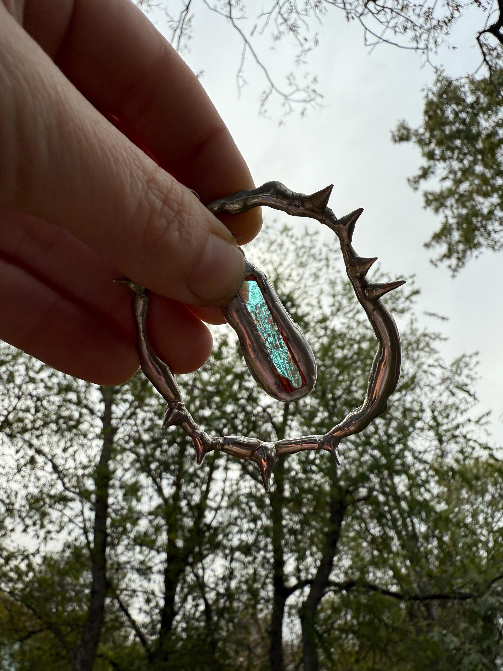 Step through the veil. This handmade soldered opalite spikey earrings. These hand soldered spikey silver hoops have orange iridesent stained glass that shine blue when light shine through them. They are hung on sterling silver ear hooks. They feel like a celestial portal artifact pulled from a cyberpunk fairy realm—equal parts fantasy, brutalist, whimsigoth, and Y2K mysticism.