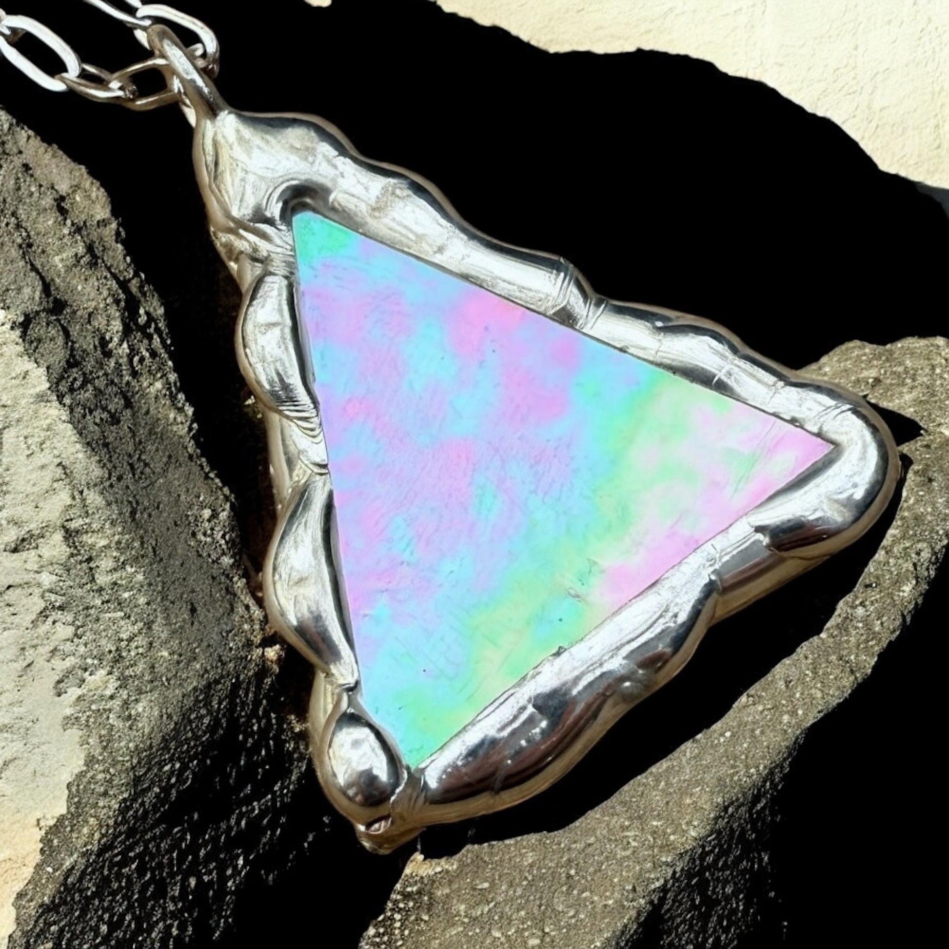 Stained Glass Pendant Necklace | Celestial Pink + Blue Triangle Portal, Soft Solder