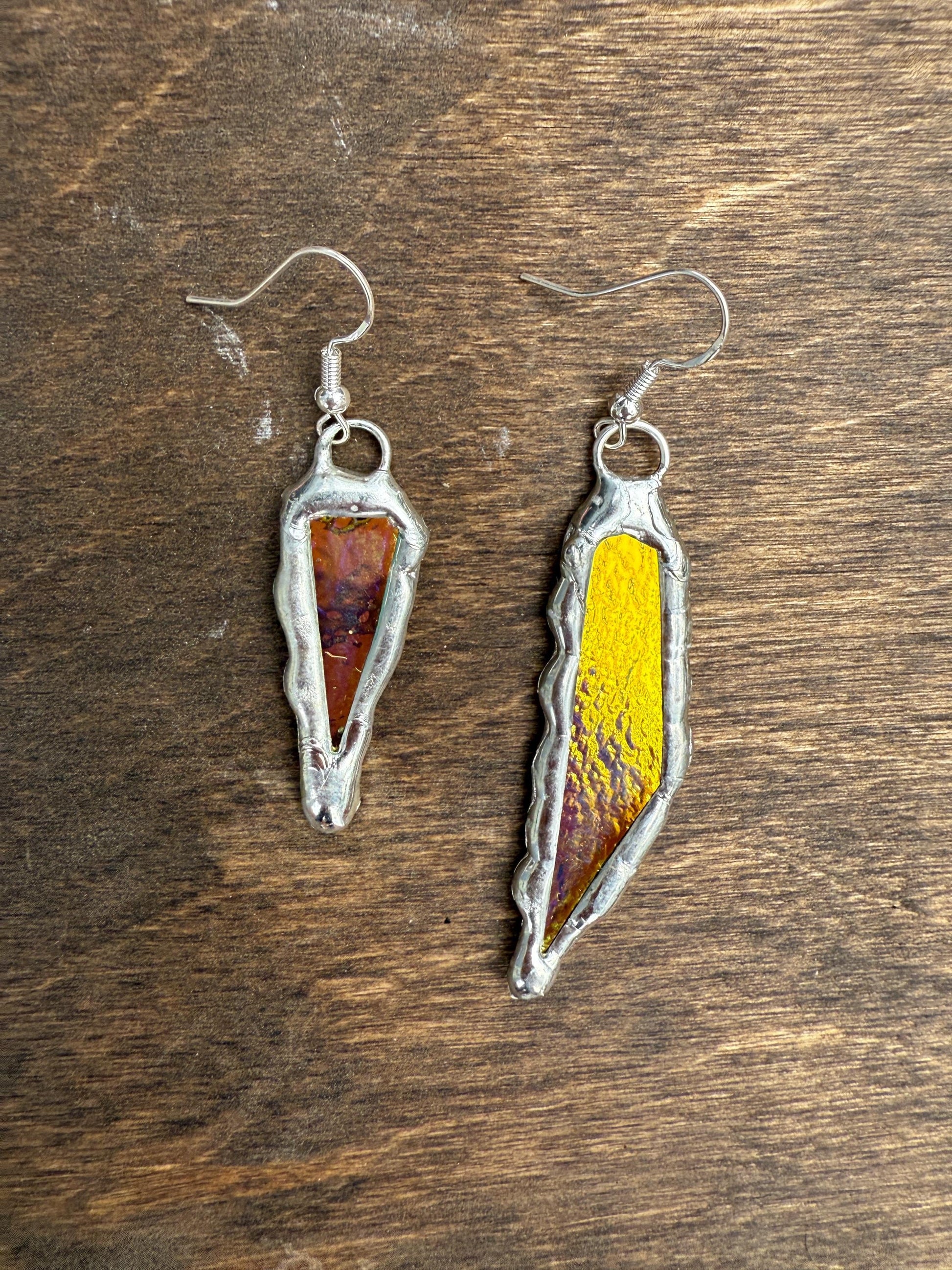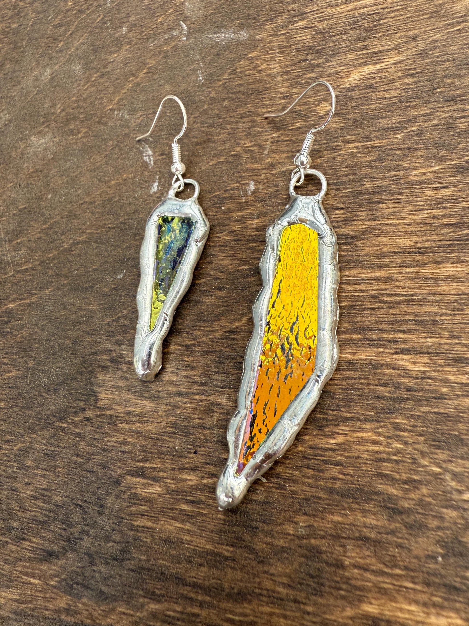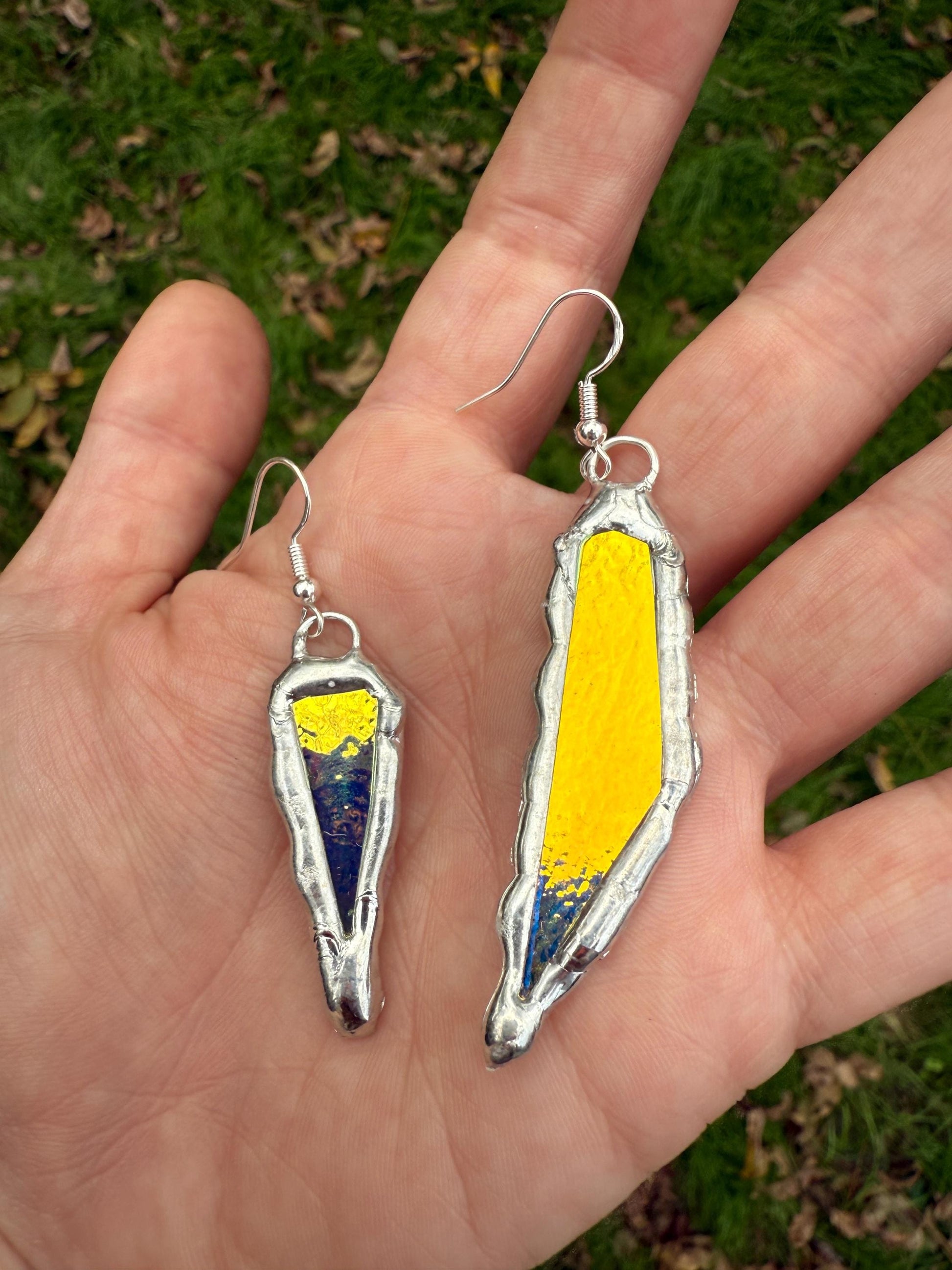 Yellow + Blue Iridescent Stained Glass Earrings | Handmade, Mismatched, Abstract, Wearable Sculptures